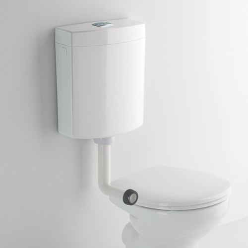 cisterna mural doble descarga regulables drena color blanco con doble pulsador 3-6l. para ahorrar agua. Envase sostenible en caja impresa PAP.