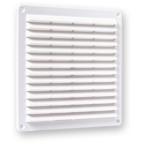 rejilla rectangular 230x230mm de superficie con red extraíble, fabricada en termoplástico color blanco.