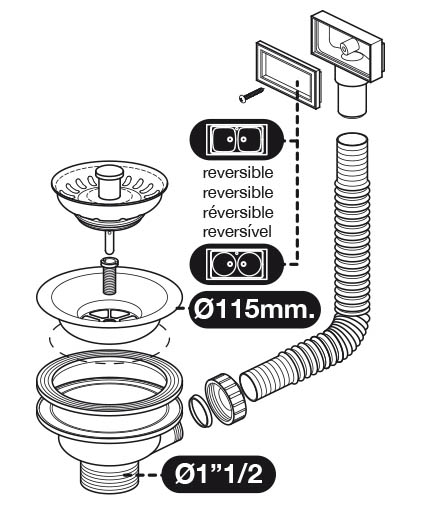 válvula roscada Ø1" 1/2 para fregadera con cuerpo de plástico, rebosadero con terminal reversible, cazoleta Ø115mm y filtro cesto-tapón de acero inoxidable.