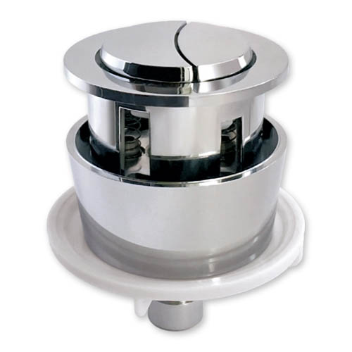 pulsador doble de recambio para mecanismo de descarga en cisterna cerámica, doble botón para descarga parcial o completa, con anillo extraíble a presión para colocarlo empotrado o de superficie en la tapa o lateral de la cisterna.