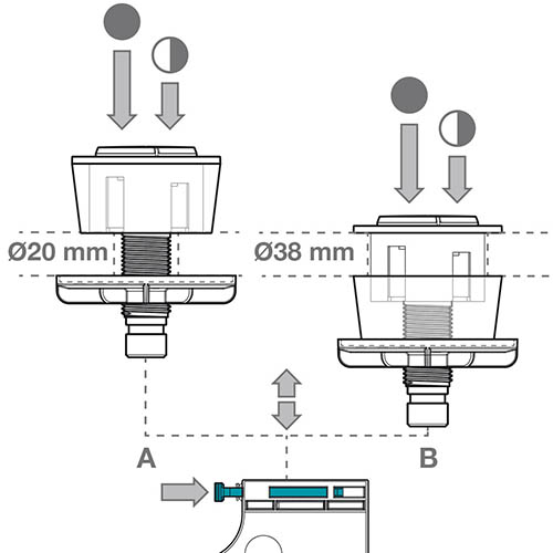 - doble descarga: pulsador doble para descarga parcial o completa para mecanismos: 00029, 00609, 00610, 00611, 00620, 00622, 00623, 00625 y 00710.